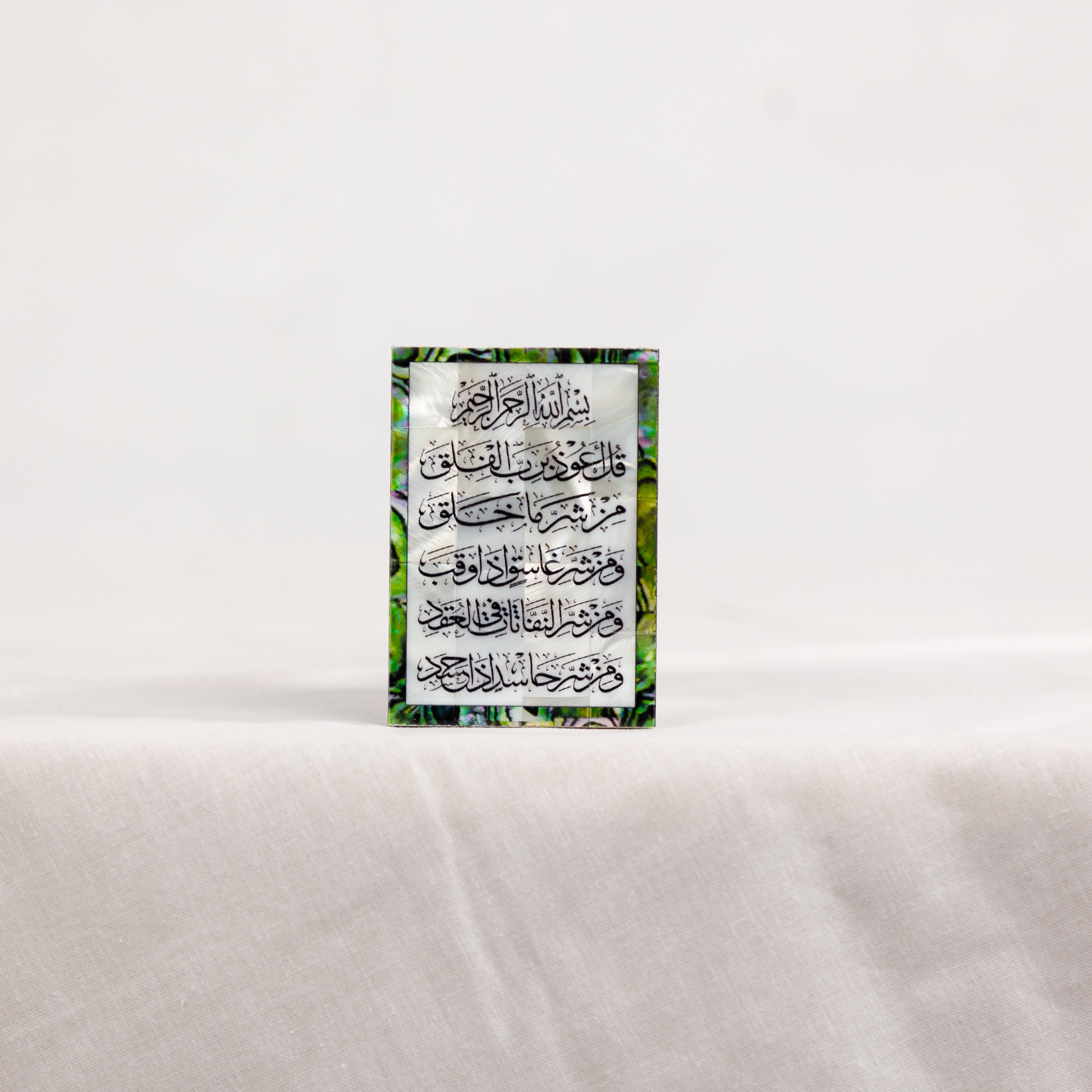 Design: Vertical plaque with Surah Al-Nas in Arabic calligraphy, bordered in iridescent Sadaf