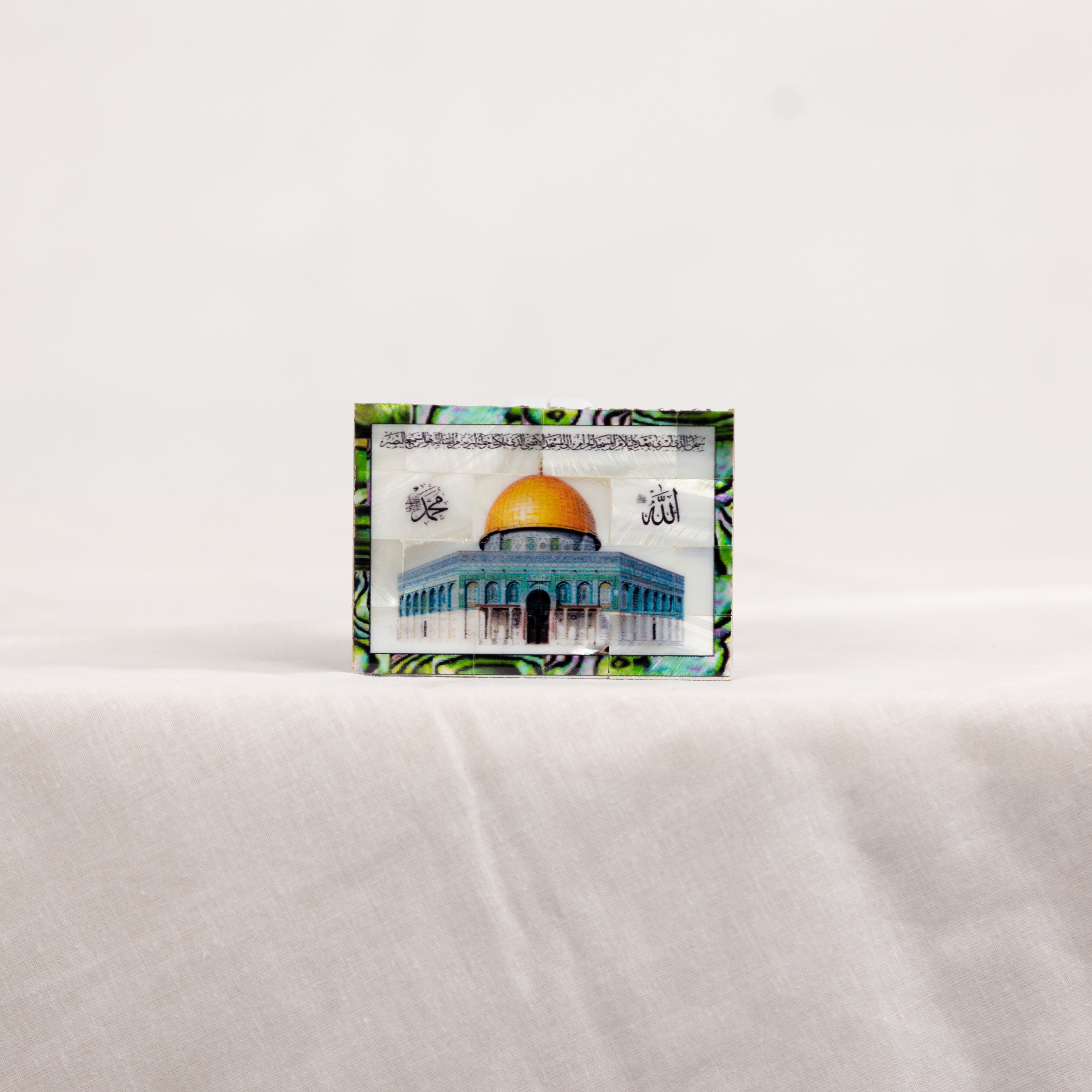 This compact yet beautifully crafted magnet showcases the Dome of the Rock, delicately inlaid with shimmering mother of pearl (sadaf). Handmade in Bethlehem, Palestine, it features Arabic calligraphy of "Allah" and "Muhammad ﷺ", along with a Quranic verse above the sacred site. Despite its small size, this piece carries deep spiritual meaning and represents the rich tradition of Palestinian craftsmanship.