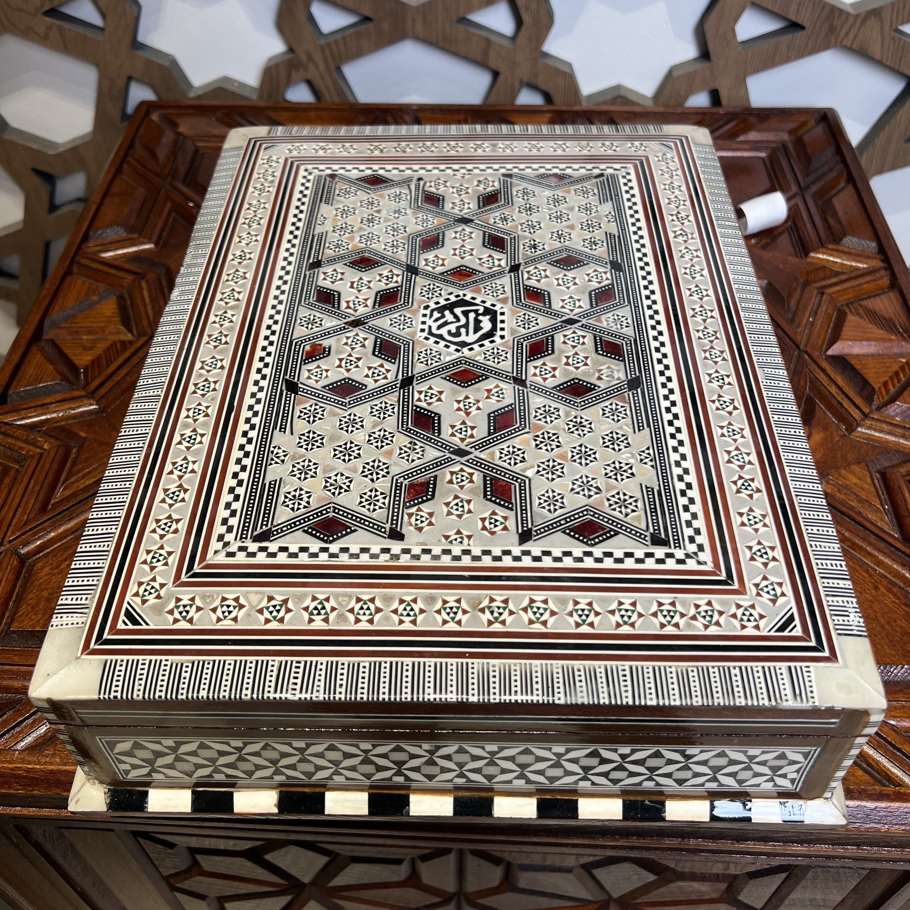 This splendid large rectangular box is a testament to the refined art of Sadaf inlay, traditionally used to house and honor the Holy Quran. Expert artisans have meticulously set pieces of shimmering mother-of-pearl into dark wood, creating an ornate geometric and floral pattern that resonates with Islamic artistry. The box is further accentuated by bands of inlaid bone and black resin, contributing to its distinguished appearance. Upon opening, the box reveals a luxurious red velvet interior with a ribbon placeholder, providing a regal resting place for the sacred text. The dimensions and the protective design make it not only a functional item for safekeeping religious scriptures but also a magnificent display piece that could adorn any home or religious setting. It serves as a cultural symbol, reflecting the importance of scripture in daily life and the dedication to craftsmanship in the Islamic world.