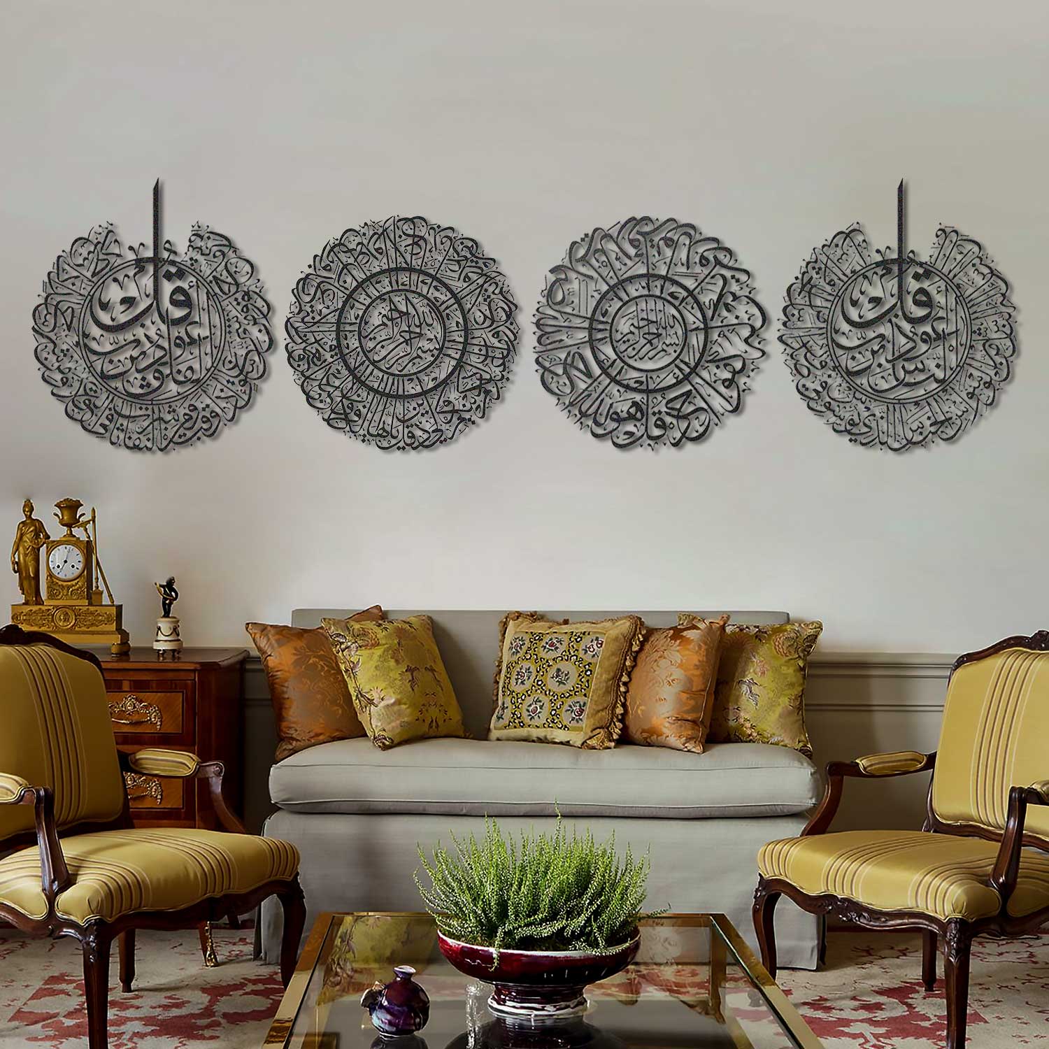 "Calligraphic Grace" offers a sophisticated take on Islamic tradition, featuring the Four Quls from the Quran: Surah Al-Nas, Surah Al-Falaq, Surah Al-Ikhlas, and Surah Al-Kafirun. These steel panels, coated with a matte finish, showcase the elegance of Islamic calligraphy in a 3D form that interacts beautifully with light and shadow. Each 49 x 49 cm or 70 x 70 cm artwork is simple to mount, thanks to the sawtooth hanger on the back, and brings a balanced visual anchor to your space. The collection stands as a testament to artistry and faith, weighing 3 kg or 7 kg, making it a substantial, yet refined, spiritual statement.