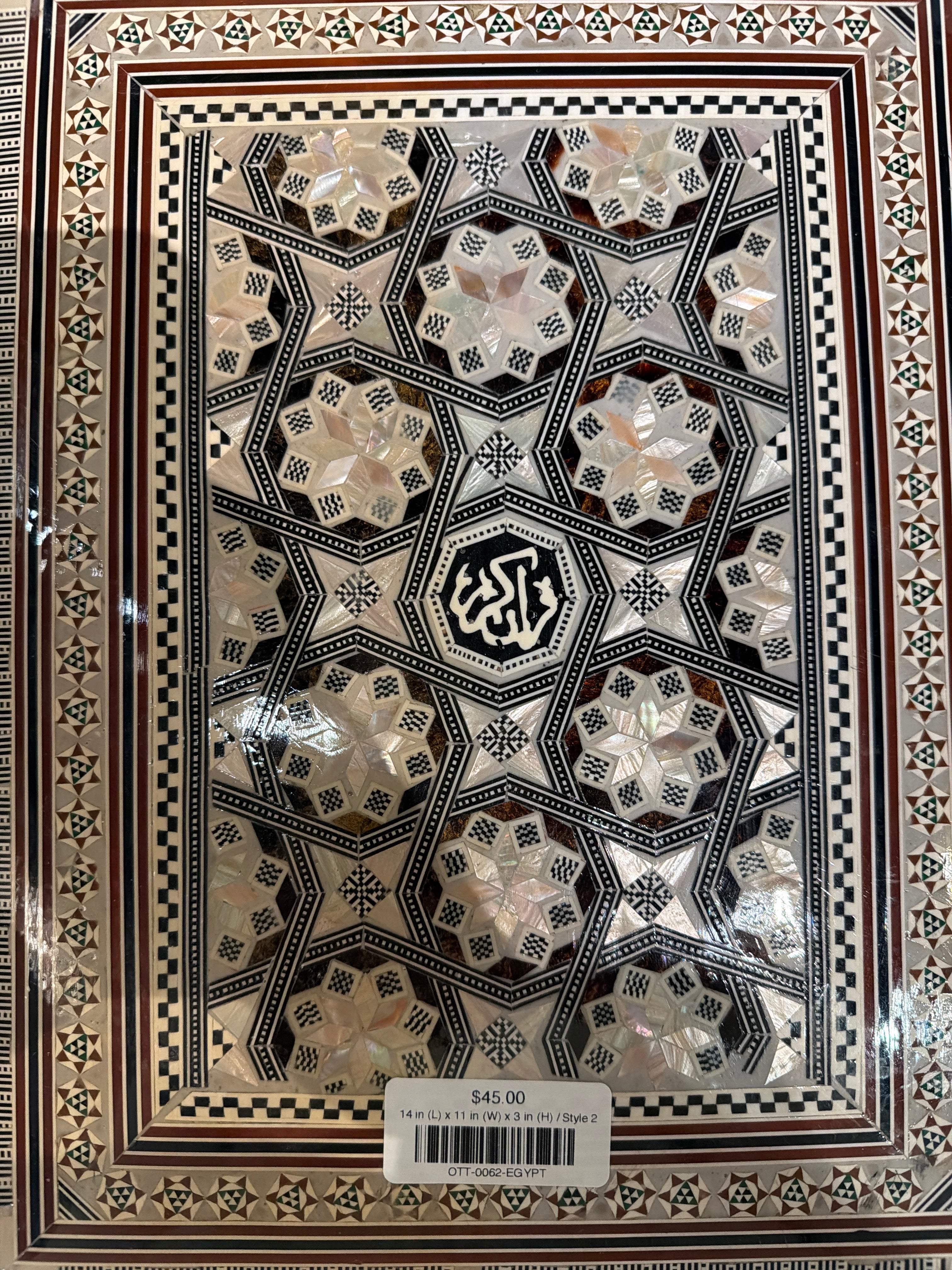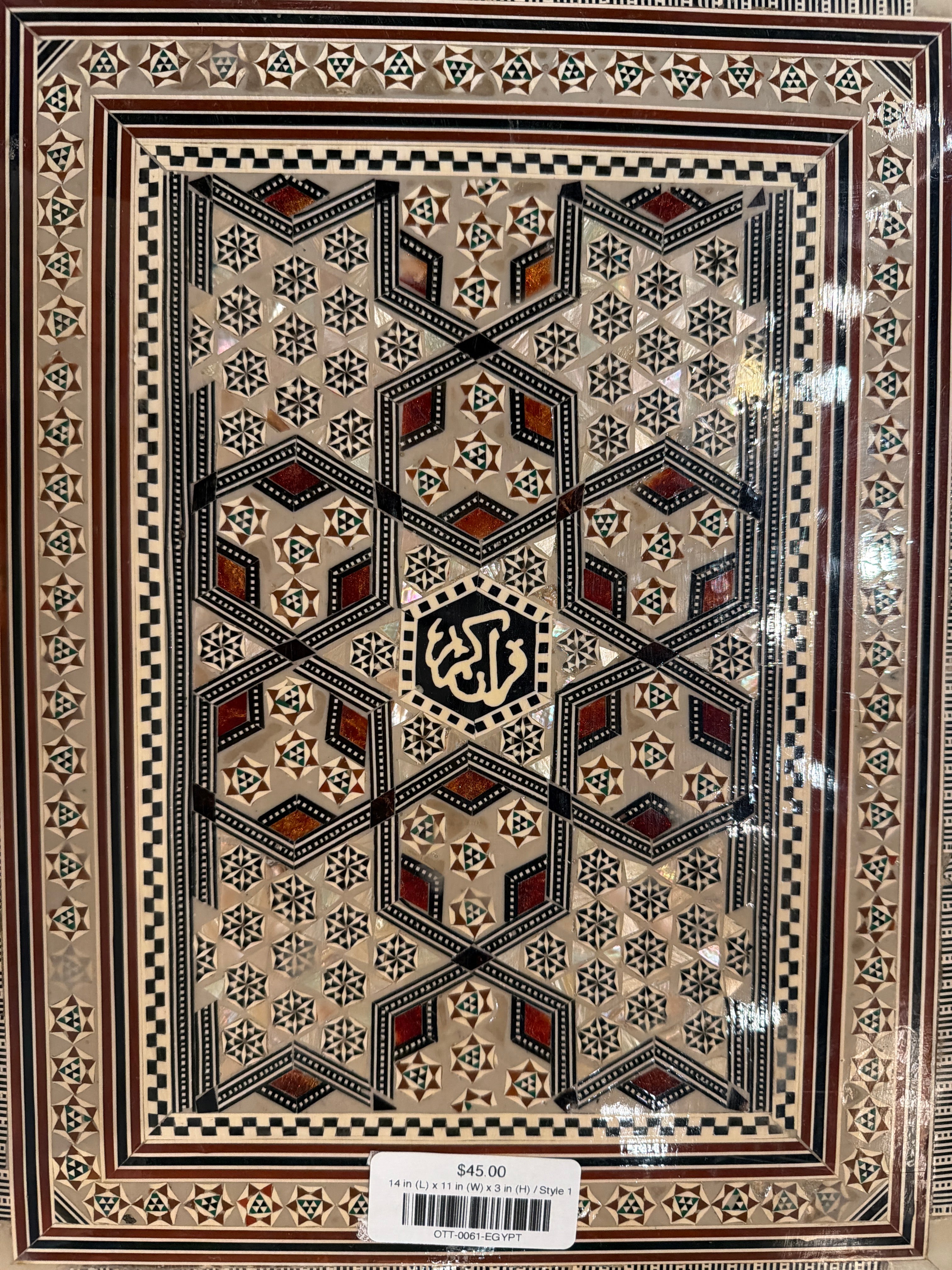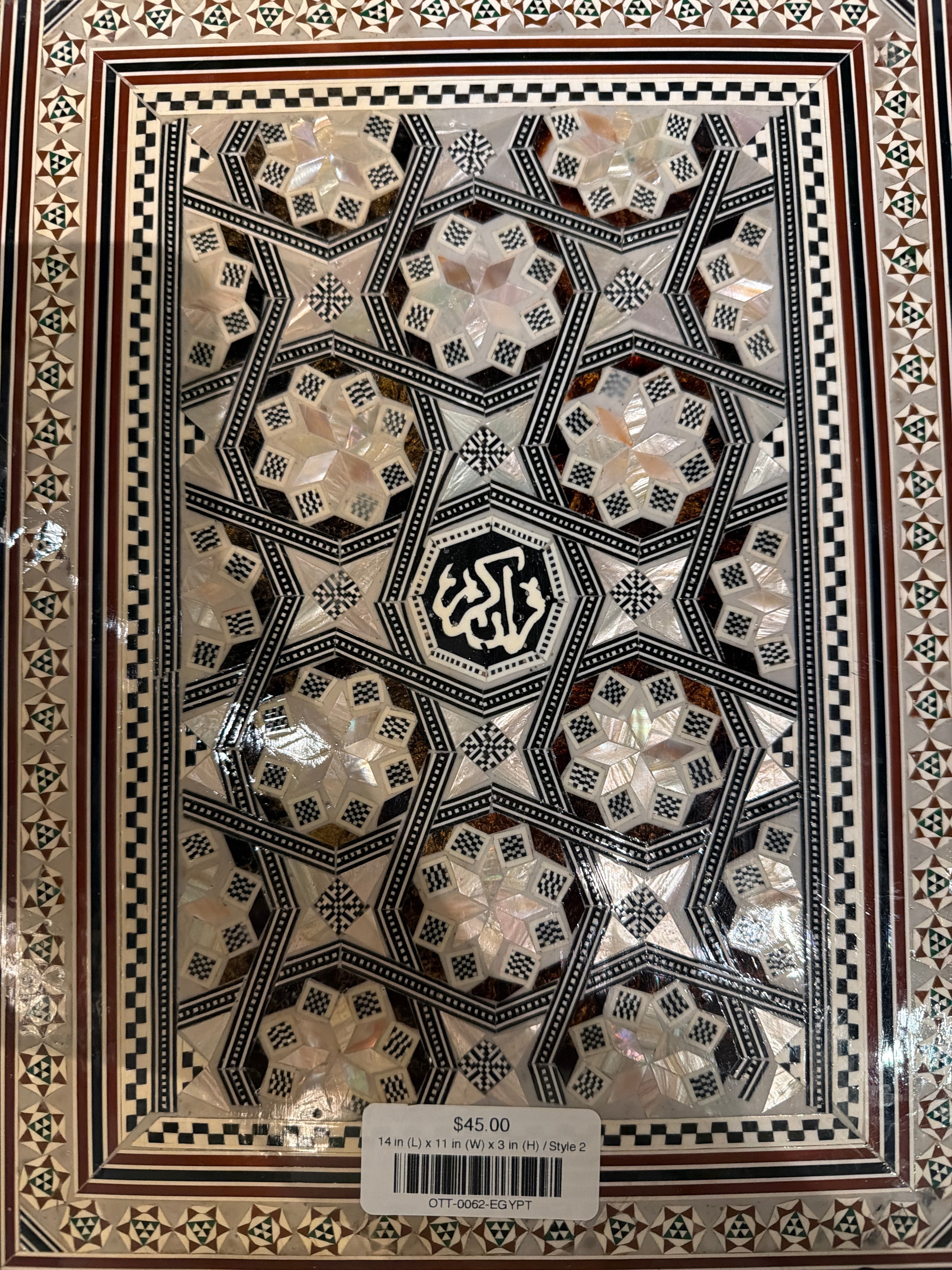 This splendid large rectangular box is a testament to the refined art of Sadaf inlay, traditionally used to house and honor the Holy Quran. Expert artisans have meticulously set pieces of shimmering mother-of-pearl into dark wood, creating an ornate geometric and floral pattern that resonates with Islamic artistry. The box is further accentuated by bands of inlaid bone and black resin, contributing to its distinguished appearance. Upon opening, the box reveals a luxurious red velvet interior with a ribbon placeholder, providing a regal resting place for the sacred text. The dimensions and the protective design make it not only a functional item for safekeeping religious scriptures but also a magnificent display piece that could adorn any home or religious setting. It serves as a cultural symbol, reflecting the importance of scripture in daily life and the dedication to craftsmanship in the Islamic world.