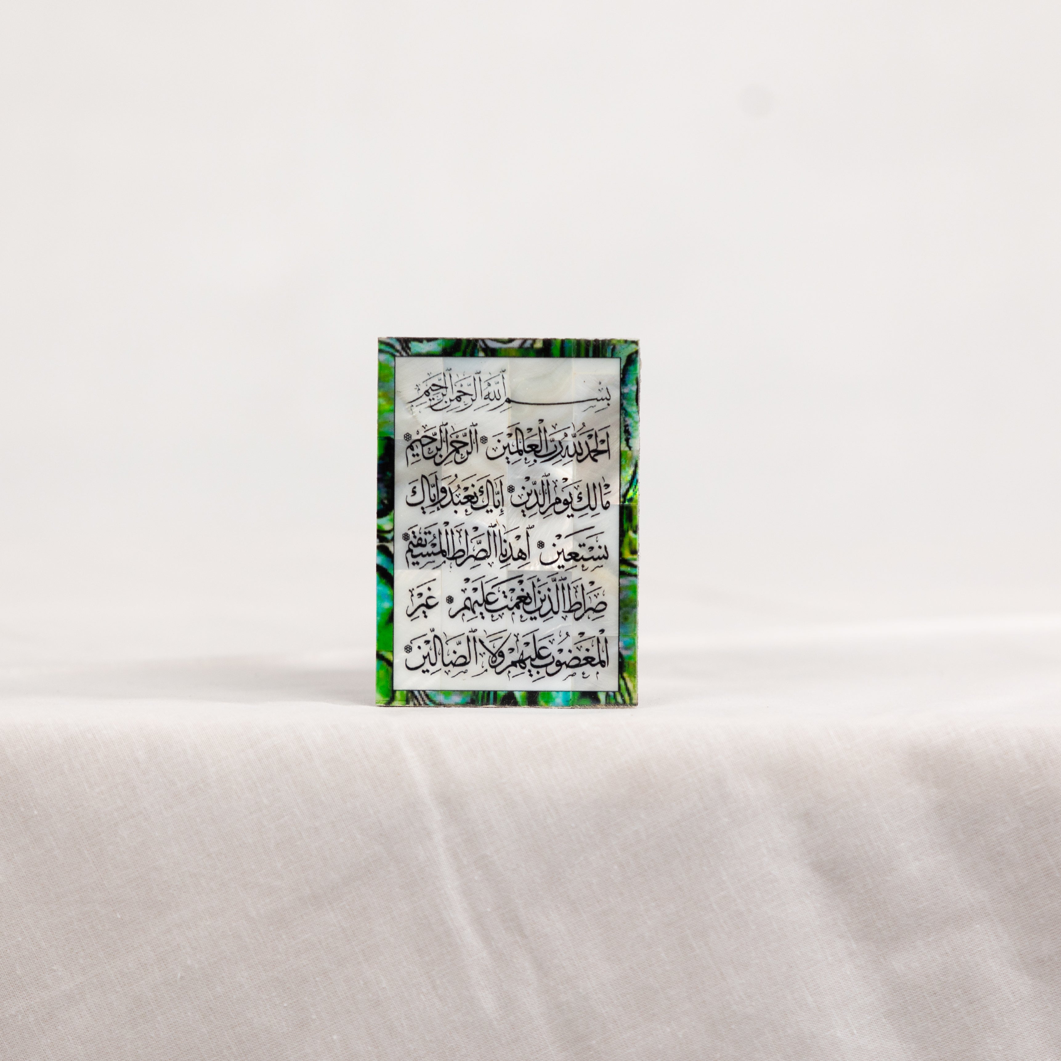 This handcrafted magnet features Surah Al-Fatiha, the Opening Chapter of the Quran, beautifully inscribed in Arabic calligraphy on shimmering mother of pearl (sadaf). Made in Bethlehem, Palestine, this piece is a spiritual centerpiece in a compact form—symbolizing guidance, mercy, and devotion. The iridescent border adds a graceful touch to the sacred words.