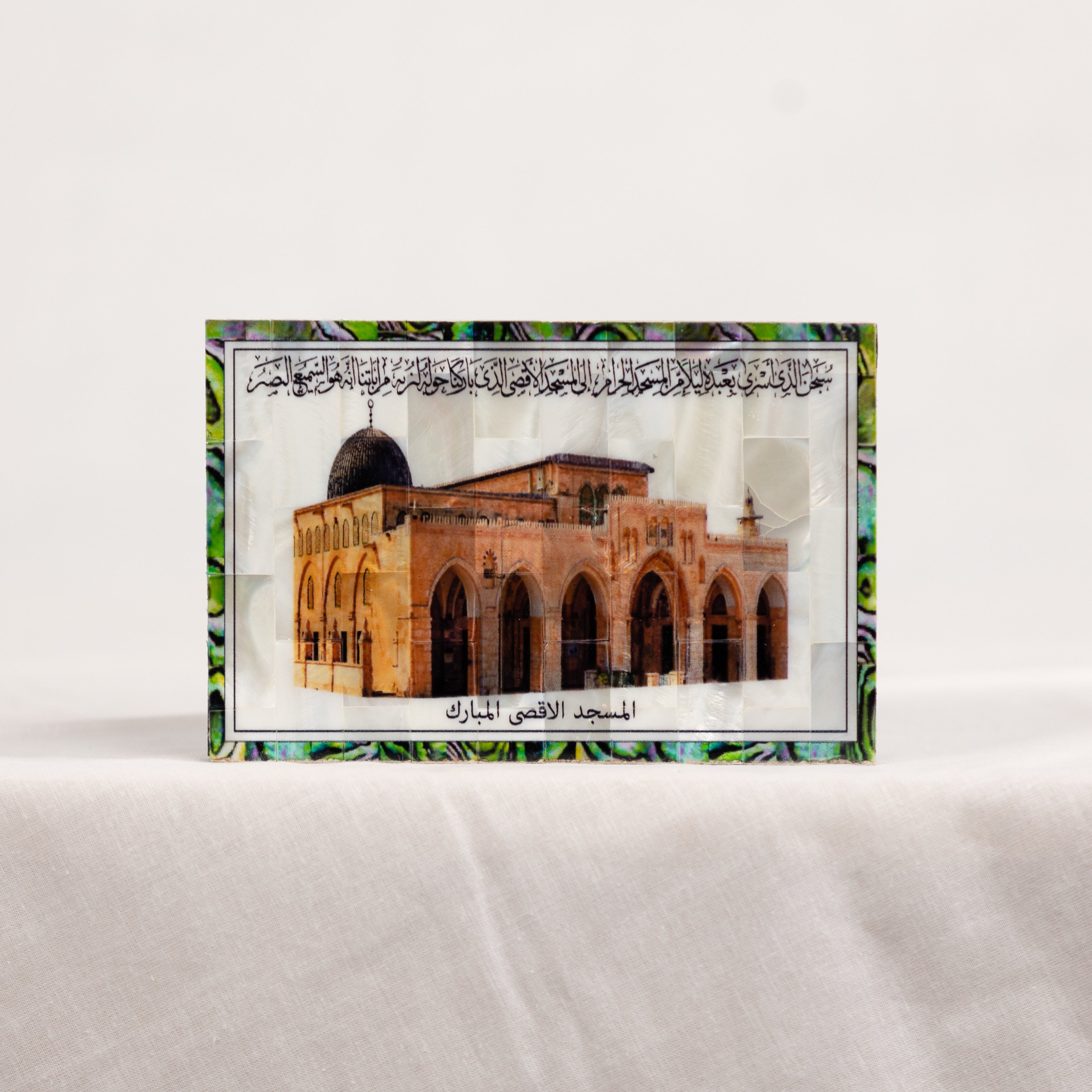 Design: Features Masjid Al-Aqsa with a Quranic verse above, bordered with luminous mother of pearl